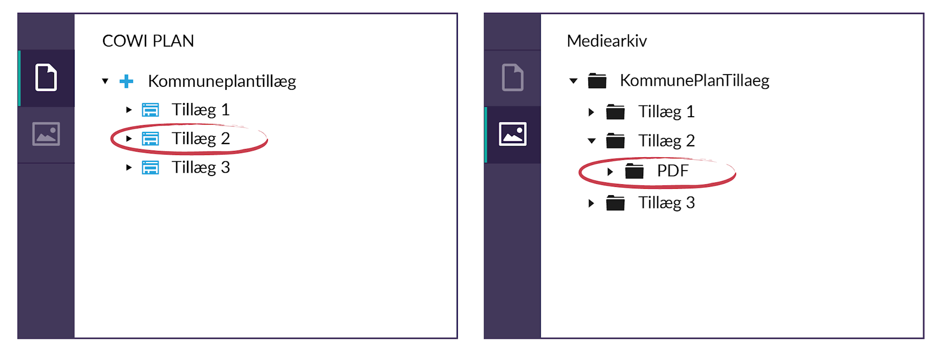 Hvis det ønskes at kombinere PDF'en, genereret i COWI PLAN med andre PDF'er gøres dette ved at downloade PDF'en og herefter redigere den i et PDF-program. I så fald er det vigtigt at PDF'en efterfølgende uploades til den samme mappe i mediearkivet (der er knyttet til planen) da det er indholdet af denne mappe, der vises når der skal vælges et dokument til indmelding.