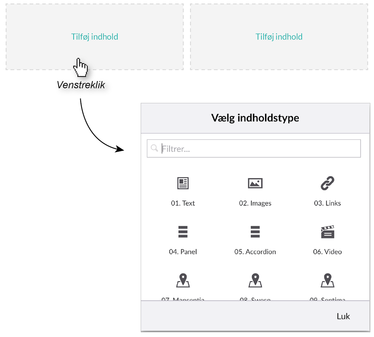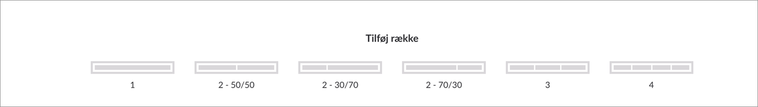 Når dette er valgt kommer en række frem med et antal bokse, der matcher den pågældende inddeling. Man tilføjer indhold ved at klikke på en boks og herefter vælge den indholdstype man ønsker at tilføje, ud fra listen der kommer frem.