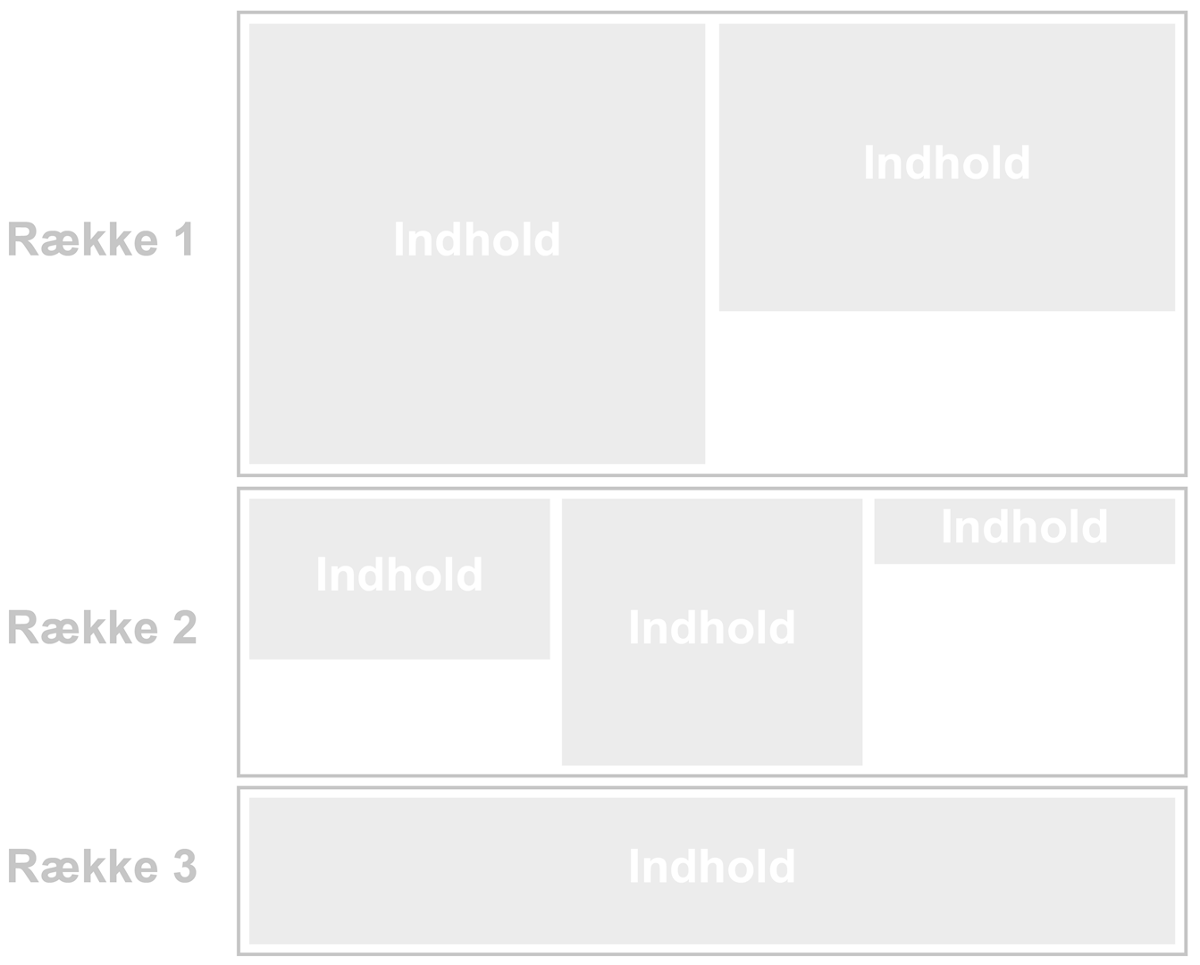 Der kan tilføjes mere indhold, både af samme type eller andre typer, til samme boks. Alle bokse i en række starter samme sted, men rækkens højde blive afgjort af den boks hvori indholdet fylder mest. Dette er illustreret nedenfor, hvor tre rækker med forskellig inddeling har indhold af varierende størrelse.