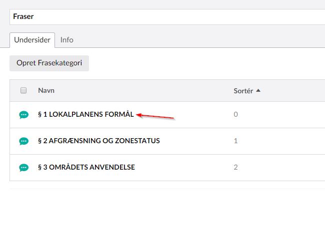 For at importere fraser navigerér til frasemodulet og vælg herefter den frasekategori som fraser ønskes importeret til.
