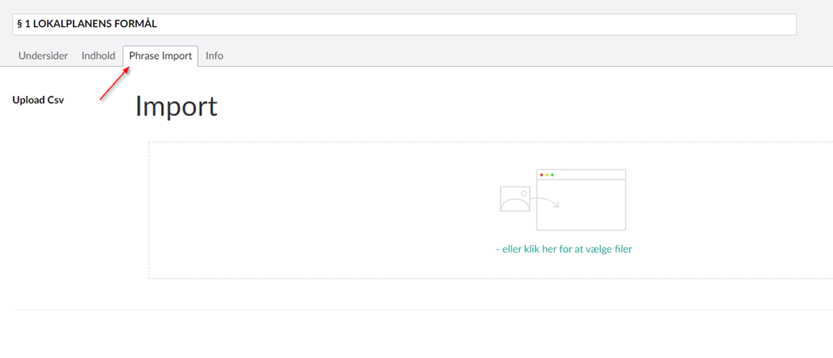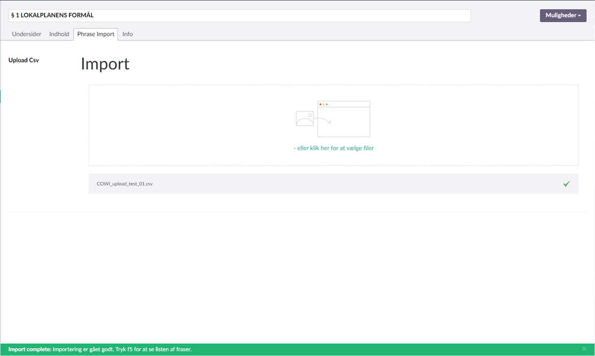 NB: Hvis importen fejler skyldes det fejl i opsætningen af .csv filen. Hvis .csv filen indeholder en fejl importeres fraserne efter et top-down princip indtil systemet møder fejlen i række X i .csv filen. Ved importfejl er det derfor muligt at lokalisere fejlen i .csv filen, da alle fraser før fejlen vil være importeret.