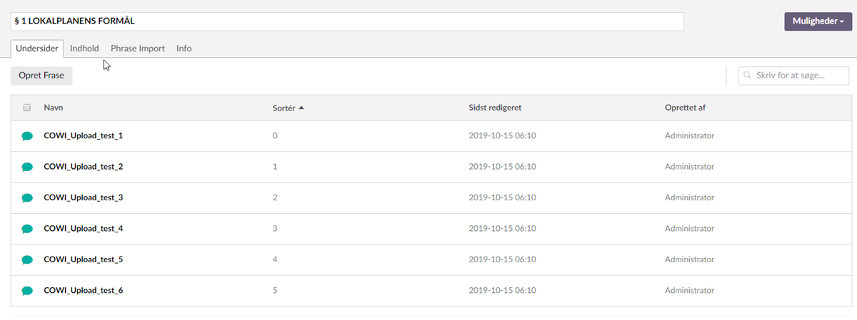 Hvis importen forløber OK beder systemet brugeren om at genindlæse siden. Derefter kan kan fraserne gennemses under fanen Undersider.