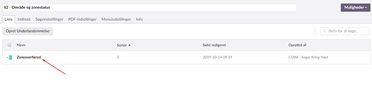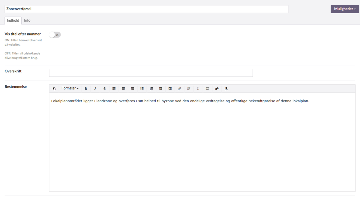 For at indsætte fraser i en lokalplanbestemmelse vælges først en underbestemmelse under noden Bestemmelser i den plan du arbejder i.