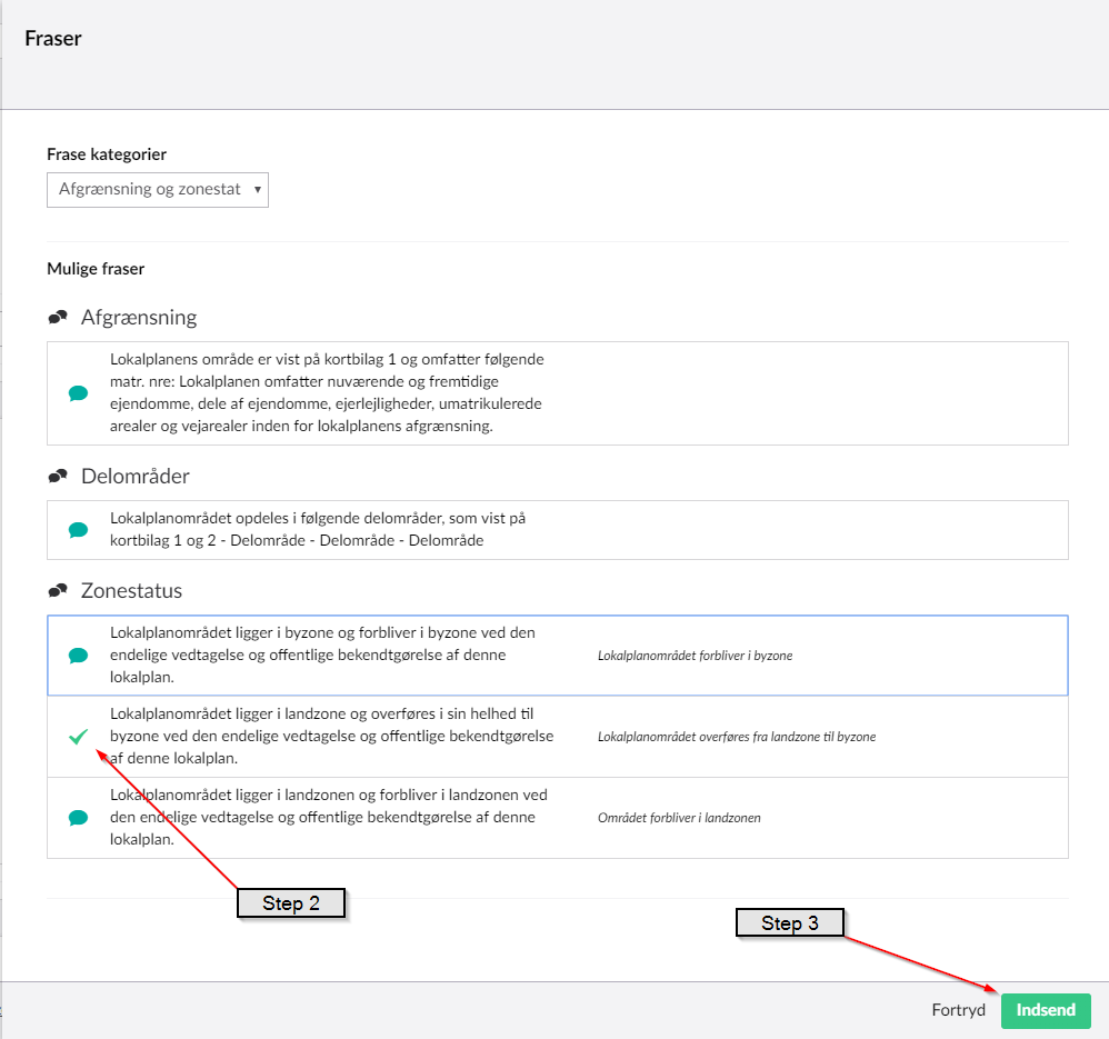 Når Indsæt frase-dialogen er åbnet indsættes fraserne via 3 skridt: