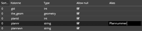 Ved at dobbelt-klikke i et felt under kolonnen "Alias" kan der indtastes et formelt navn der vises i konfliktsøgerresultatet i stedet for det tekniske navn.
