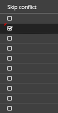 Listevisningen har en kolonne med titlen "Skip conflict". Her kan der sættes flueben ved de lag der ikke ønskes medtaget i konfliktsøgeren.