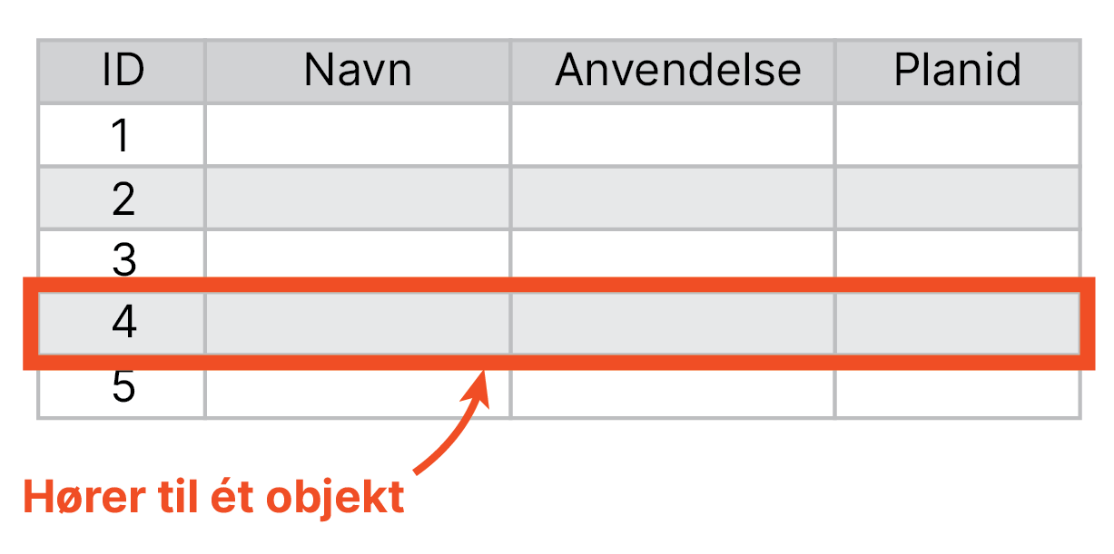 En række i attributtabellen hører således til et enkelt objekt i vektorlaget og indeholder én attribut for hvert felt.