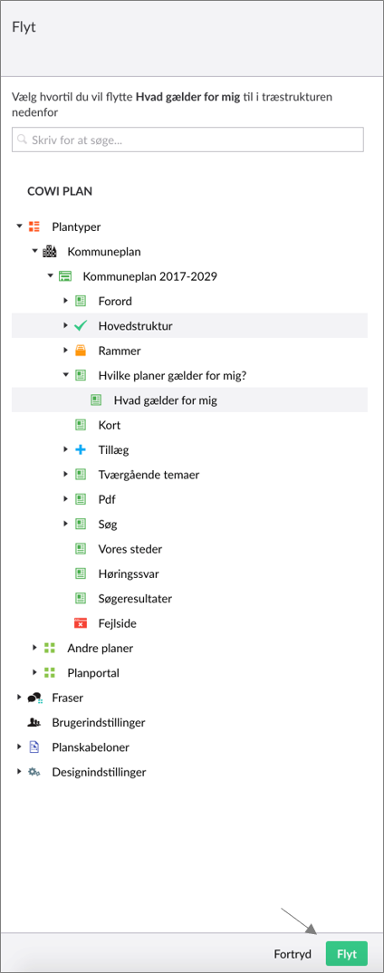 Klik på "Flyt" i panelet der fremkommer. Herefter vælges hvor i sidetræet den valgte side skal flyttes til. Afslut ved at klikke på "Flyt" i højre hjørne af panelet.
