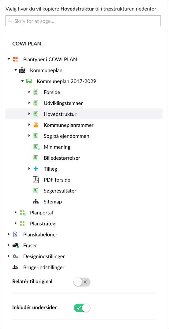 Det er ydermere muligt at kopiere sider, der har egne undersider tilknyttet. For at kopiere side og tilhørende underside(r) sikres det blot at "Inkludér undersider" i bunden af panelet, er aktiveret.