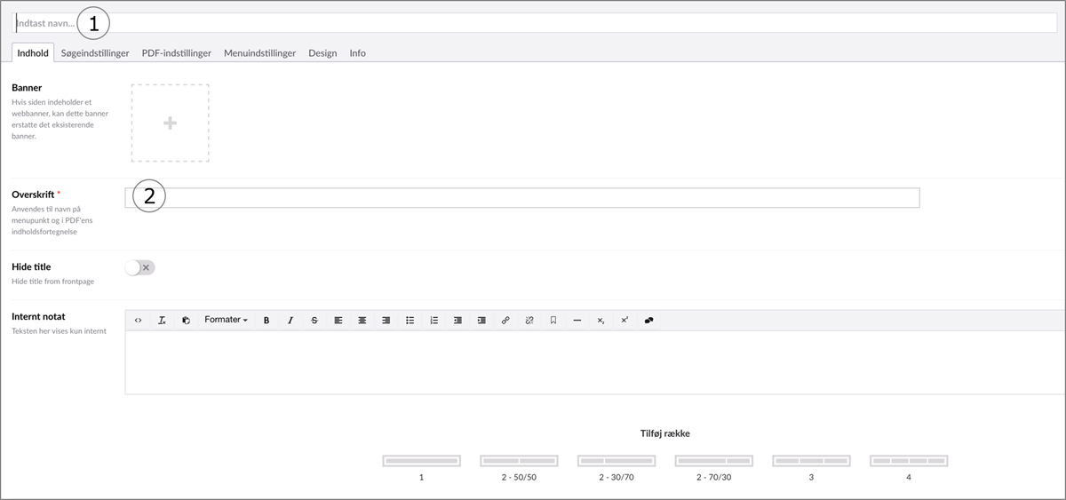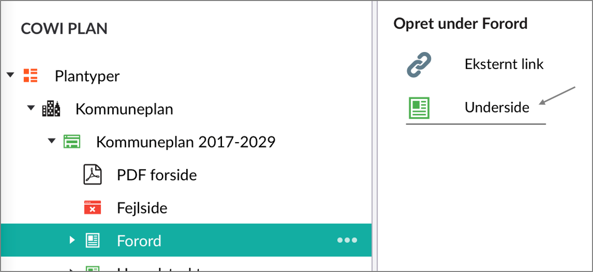 For at tilføje en ny side til sidetræet bestemmes først den overside man ønsker at tilknytte den nye underside til. Herefter trykkes på de tre prikker, der bliver synlige når musen svæver over den valgte side. (Alternativt højre-klik på den valgte side og klikker derefter på "Opret" i panelet der fremkommer).